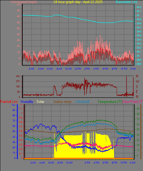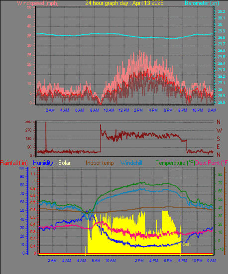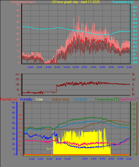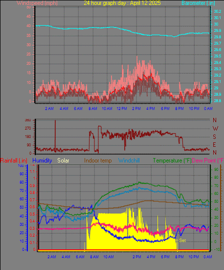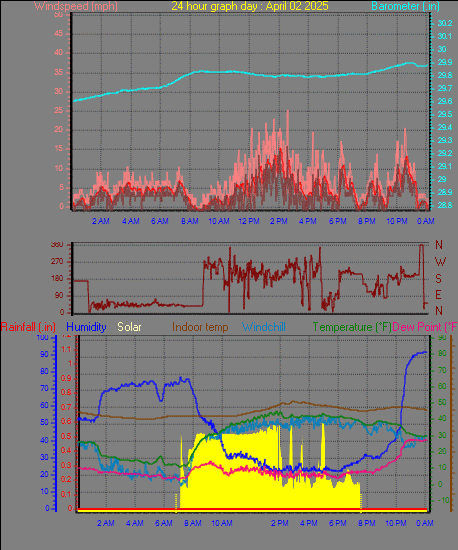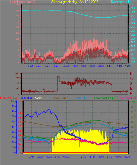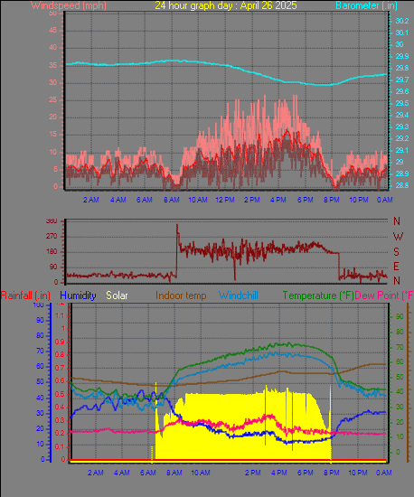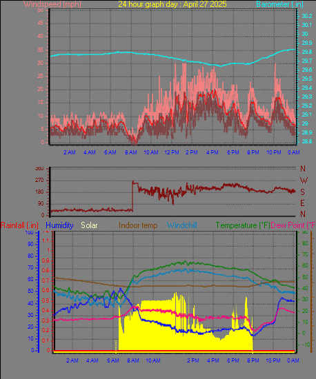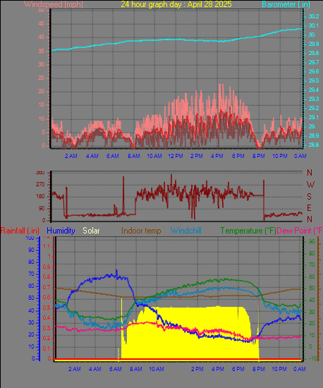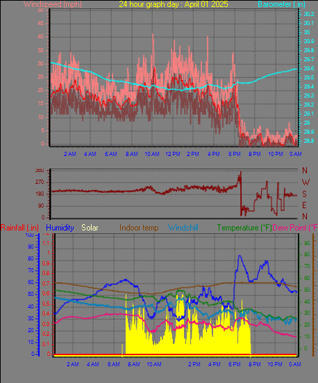 Maximum windspeed = 32.2 mph from 213°(SSW) on day 01 at time 12:12