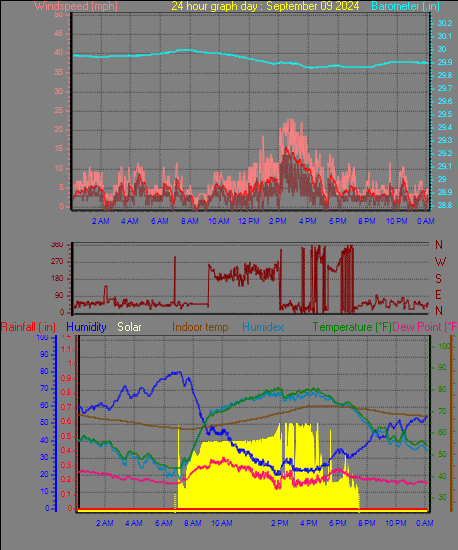 Maximum gust speed = 23.0 mph from 298 °(WNW) on day 29 at time 16:19