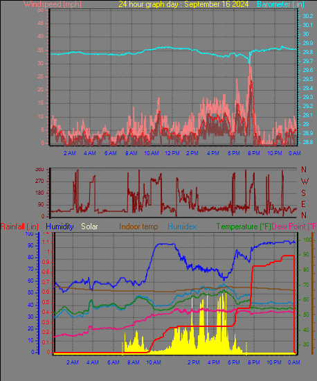 Maximum windspeed = 27.6 mph from 181°( S ) on day 16 at time 19:36