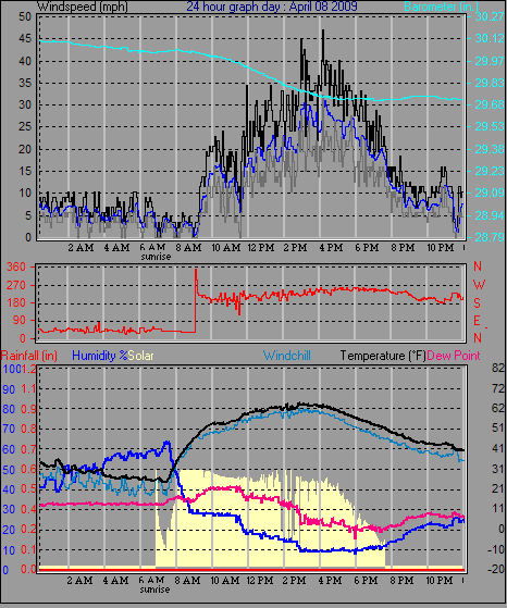 Maximum windspeed = 36.8 mph from 225°( SW) on day 08 at time 16:13
