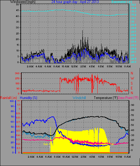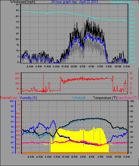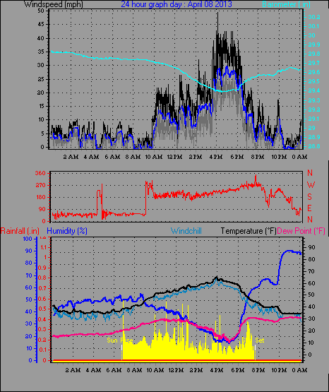 Maximum windspeed = 36.8 mph from 225°( SW) on day 08 at time 16:09