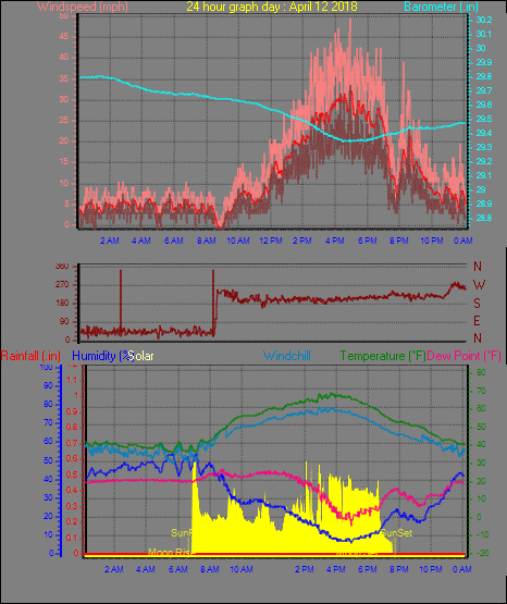Maximum windspeed = 36.8 mph from 203°(SSW) on day 12 at time 16:58