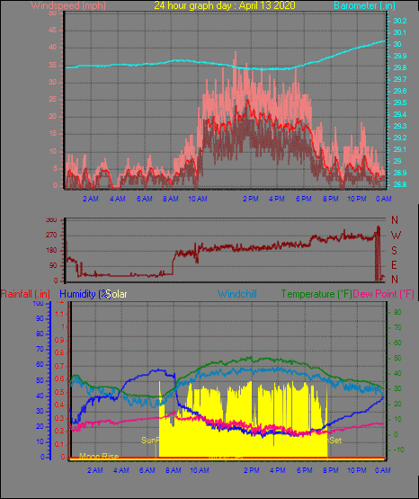 Maximum windspeed = 28.8 mph from 201°(SSW) on day 13 at time 13:38