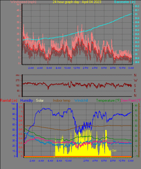 Maximum windspeed = 33.4 mph from 205°(SSW) on day 03 at time 17:52