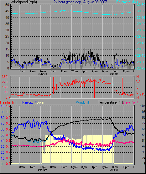 Maximum windspeed 15.0 mph from 238° on day 04 at time 16:30
