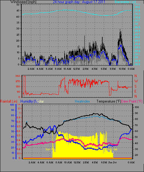 Maximum windspeed = 28.8 mph from 203°(SSW) on day 13 at time 17:03