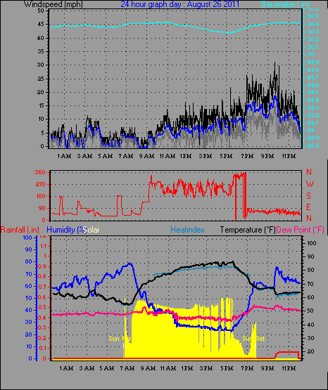 Maximum windspeed = 26.5 mph on day 31 at time 14:30