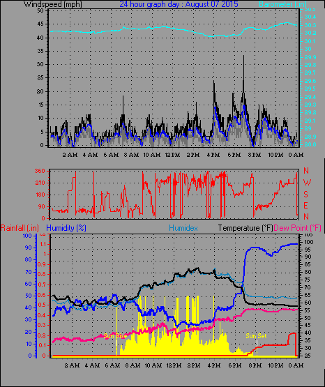 Maximum gust speed = 33.4 mph from 248°(WSW) on day 07 at time 18:53