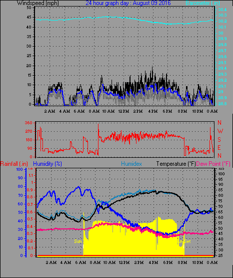 Maximum gust speed = 16.1 mph from 225 °( SW) on day 31 at time 17:21