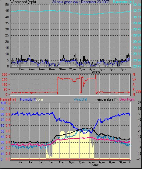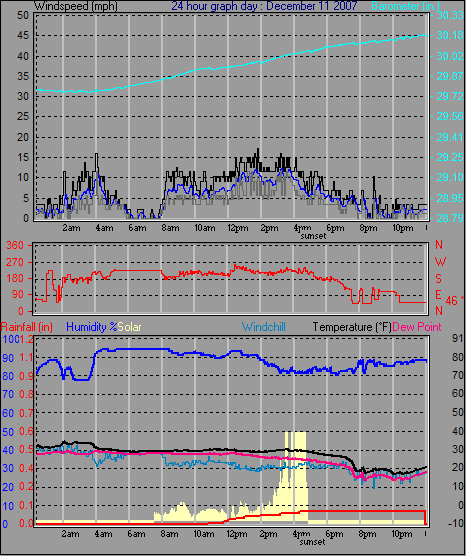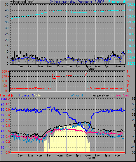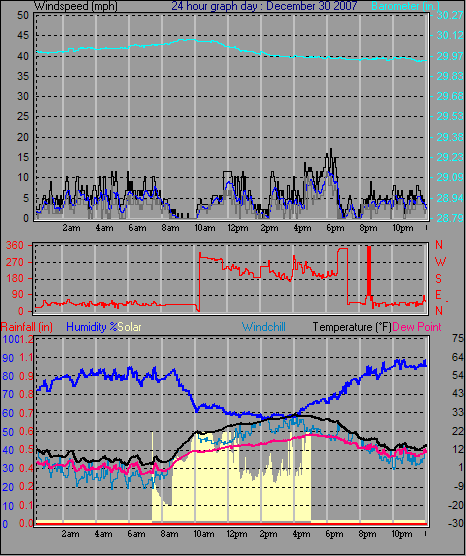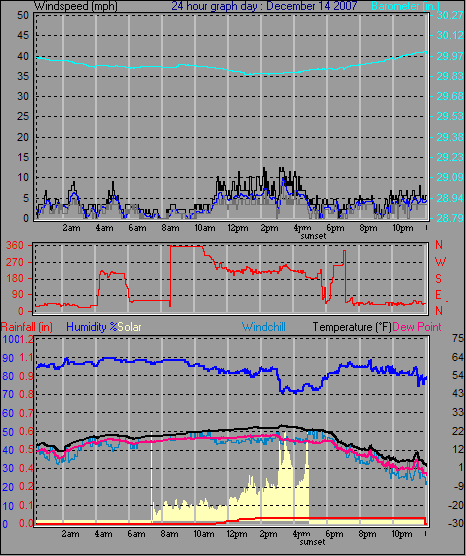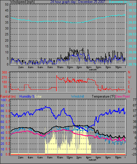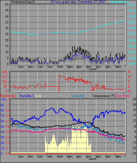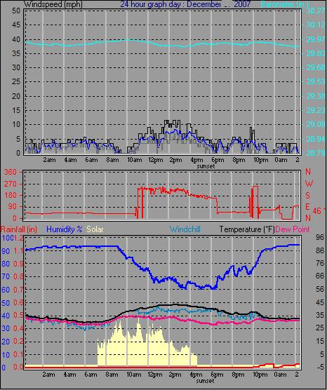 Averages\Extremes for the month of December to 31 2007 ------------------------------------------------------------ Average temperature 22.4 °F Average humidity 77 % Average dewpoint 15.8 °F Average barometer 30.05 in. Average windspeed 3.8 mph Average gustspeed 4.9 mph Average direction 59 ° (ENE) Rainfall for month 3.17 in. Rainfall for year 16.77 in. ----------------------------------------------------------- Maximum rain per minute 0.02 in. on day 01 at time 14:53 Maximum temperature 48.2 °F on day 04 at time 15:27 Minimum temperature -9.8 °F on day 28 at time 07:28 Maximum humidity 99 % on day 01 at time 18:51 Minimum humidity 20 % on day 31 at time 13:17 Maximum pressure 30.64 in. on day 03 at time 10:08 Minimum pressure 29.53 in. on day 27 at time 05:47 Maximum windspeed 29.9 mph from 214° on day 01 at time 17:51 Maximum gust speed 40.3 mph from 198° on day 01 at time 17:50 Maximum heat index 48.2 °F on day 04 at time 15:27 Growing degrees days : 32.0 °F ------------------------------------------- Sunshine hours , ET, Max solar for each day 01 00.2hrs ,ET :0.020 in. ,234.0 W/M² 02 05.3hrs ,ET :0.031 in. ,680.0 W/M² 03 06.5hrs ,ET :0.031 in. ,578.0 W/M² 04 07.5hrs ,ET :0.031 in. ,580.0 W/M² 05 01.8hrs ,ET :0.020 in. ,564.0 W/M² 06 00.1hrs ,ET :0.028 in. ,404.0 W/M² 07 00.0hrs ,ET :0.012 in. ,65.0 W/M² 08 00.0hrs ,ET :0.008 in. ,202.0 W/M² 09 03.8hrs ,ET :0.020 in. ,788.0 W/M² 10 00.1hrs ,ET :0.012 in. ,439.0 W/M² 11 01.1hrs ,ET :0.012 in. ,555.0 W/M² 12 04.7hrs ,ET :0.024 in. ,693.0 W/M² 13 05.7hrs ,ET :0.024 in. ,719.0 W/M² 14 00.4hrs ,ET :0.008 in. ,304.0 W/M² 15 06.3hrs ,ET :0.020 in. ,601.0 W/M² 16 06.5hrs ,ET :0.024 in. ,570.0 W/M² 17 06.3hrs ,ET :0.028 in. ,561.0 W/M² 18 05.7hrs ,ET :0.031 in. ,696.0 W/M² 19 02.4hrs ,ET :0.024 in. ,582.0 W/M² 20 03.3hrs ,ET :0.020 in. ,636.0 W/M² 21 00.4hrs ,ET :0.016 in. ,281.0 W/M² 22 04.2hrs ,ET :0.016 in. ,606.0 W/M² 23 06.5hrs ,ET :0.028 in. ,559.0 W/M² 24 01.8hrs ,ET :0.020 in. ,454.0 W/M² 25 03.1hrs ,ET :0.020 in. ,559.0 W/M² 26 04.5hrs ,ET :0.024 in. ,677.0 W/M² 27 03.4hrs ,ET :0.016 in. ,733.0 W/M² 28 05.7hrs ,ET :0.020 in. ,531.0 W/M² 29 07.4hrs ,ET :0.028 in. ,571.0 W/M² 30 04.1hrs ,ET :0.028 in. ,722.0 W/M² 31 00.0hrs ,ET :0.000 in. ,585.0 W/M² Sunshine hours month to date= 116.4 hrs Sunshine hours year to date= 0.0 hrs ------------------------------------------------------------ Daily rain totals 0.86 in. on day 1 0.13 in. on day 2 0.01 in. on day 3 0.02 in. on day 5 0.03 in. on day 6 1.37 in. on day 7 0.24 in. on day 8 0.08 in. on day 9 0.21 in. on day 10 0.08 in. on day 11 0.06 in. on day 12 0.01 in. on day 13 0.04 in. on day 14 0.01 in. on day 16 0.01 in. on day 20 0.01 in. on day 28 ------------------------------------------------------------