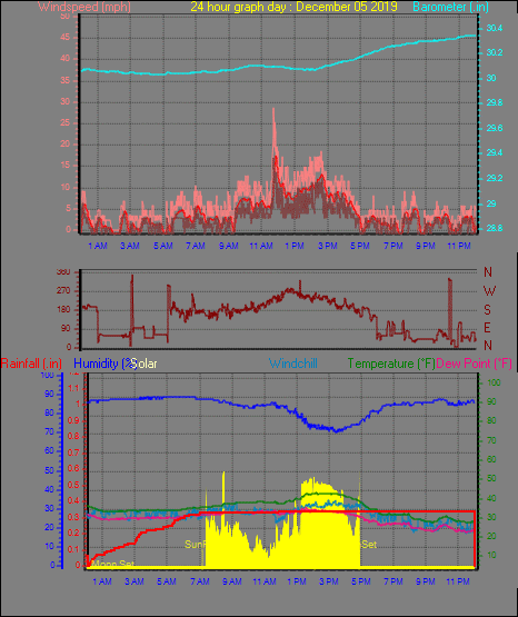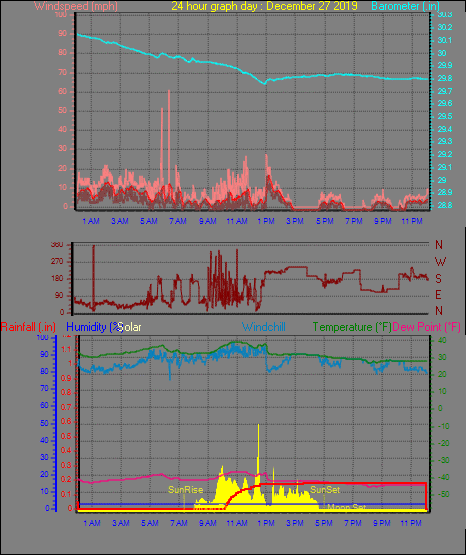 Maximum windspeed = 50.6 mph from 059°(ENE) on day 27 at time 06:23