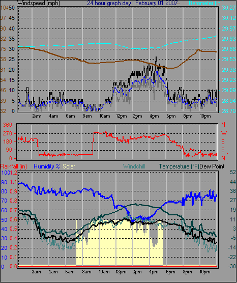 Maximum windspeed 23.0 mph from 235° on day 01 at time 16:47