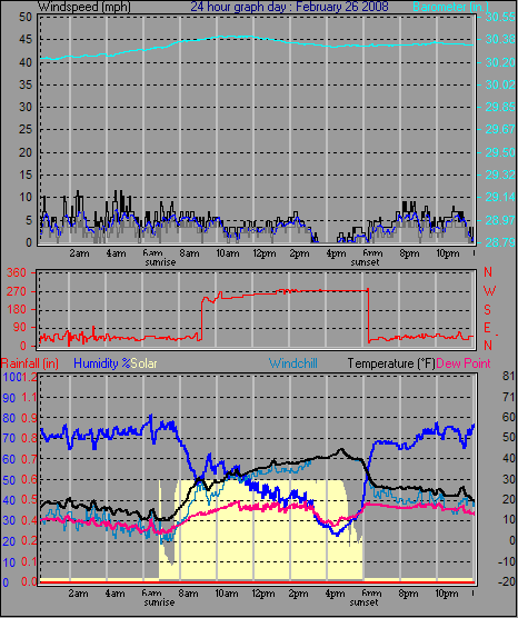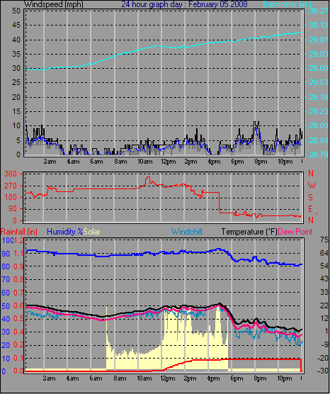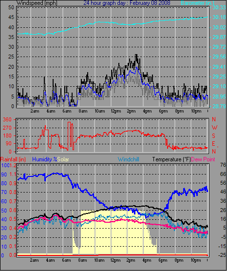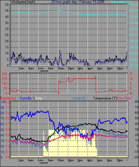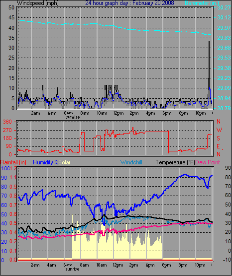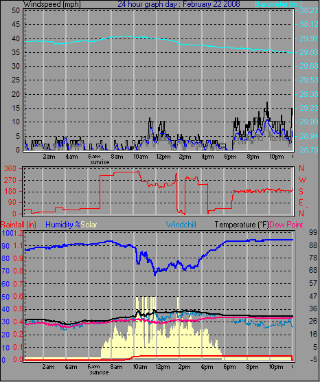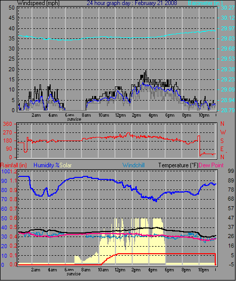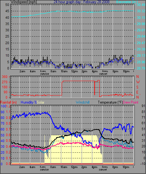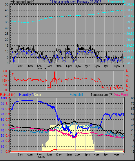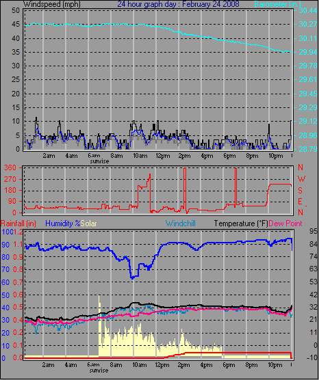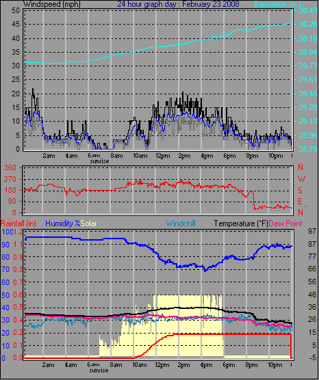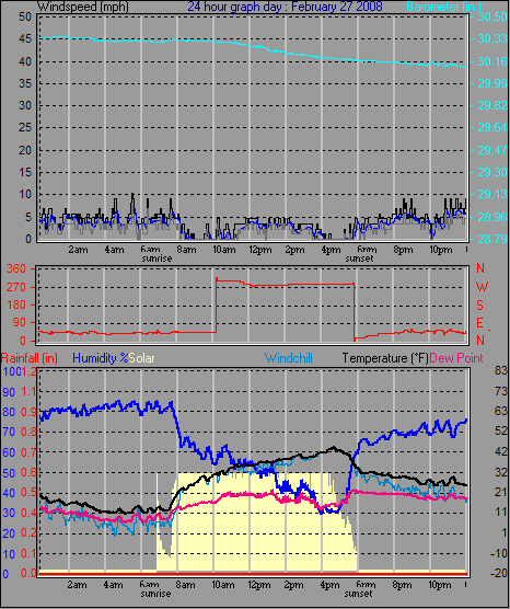 Averages\Extremes for the month of February to 29 2008 ------------------------------------------------------------ Average temperature 24.9 °F Average humidity 75 % Average dewpoint 17.5 °F Average barometer 30.01 in. Average windspeed 4.1 mph Average gustspeed 5.2 mph Average direction 139 ° ( SE) Rainfall for month 0.97 in. Rainfall for year 2.78 in. ----------------------------------------------------------- Maximum rain per minute 0.01 in. on day 23 at time 13:35 Maximum temperature 50.9 °F on day 28 at time 15:39 Minimum temperature -4.8 °F on day 07 at time 08:15 Maximum humidity 98 % on day 03 at time 21:24 Minimum humidity 23 % on day 26 at time 16:40 Maximum pressure 30.41 in. on day 26 at time 10:41 Minimum pressure 29.52 in. on day 03 at time 00:57 Maximum windspeed 23.0 mph from 224° on day 20 at time 23:37 Maximum gust speed 36.8 mph from 215° on day 20 at time 23:36 Maximum heat index 50.9 °F on day 28 at time 15:39 Growing degrees days : 32.0 °F ------------------------------------------- Sunshine hours , ET, Max solar for each day 01 00.6hrs ,ET :0.031 in. ,406.0 W/M² 02 01.3hrs ,ET :0.020 in. ,526.0 W/M² 03 00.0hrs ,ET :0.008 in. ,181.0 W/M² 04 00.3hrs ,ET :0.012 in. ,596.0 W/M² 05 02.6hrs ,ET :0.016 in. ,896.0 W/M² 06 06.5hrs ,ET :0.024 in. ,752.0 W/M² 07 06.4hrs ,ET :0.031 in. ,793.0 W/M² 08 08.1hrs ,ET :0.051 in. ,722.0 W/M² 09 08.7hrs ,ET :0.051 in. ,779.0 W/M² 10 08.8hrs ,ET :0.051 in. ,752.0 W/M² 11 08.6hrs ,ET :0.047 in. ,1002.0 W/M² 12 09.1hrs ,ET :0.051 in. ,740.0 W/M² 13 08.4hrs ,ET :0.059 in. ,759.0 W/M² 14 00.1hrs ,ET :0.039 in. ,376.0 W/M² 15 04.9hrs ,ET :0.051 in. ,954.0 W/M² 16 09.0hrs ,ET :0.063 in. ,925.0 W/M² 17 09.2hrs ,ET :0.059 in. ,770.0 W/M² 18 09.2hrs ,ET :0.059 in. ,782.0 W/M² 19 07.1hrs ,ET :0.059 in. ,962.0 W/M² 20 00.9hrs ,ET :0.043 in. ,754.0 W/M² 21 04.3hrs ,ET :0.047 in. ,1169.0 W/M² 22 01.7hrs ,ET :0.035 in. ,896.0 W/M² 23 06.2hrs ,ET :0.047 in. ,925.0 W/M² 24 00.0hrs ,ET :0.020 in. ,424.0 W/M² 25 08.8hrs ,ET :0.083 in. ,810.0 W/M² 26 09.5hrs ,ET :0.087 in. ,824.0 W/M² 27 09.1hrs ,ET :0.083 in. ,824.0 W/M² 28 08.4hrs ,ET :0.083 in. ,853.0 W/M² 29 00.0hrs ,ET :0.000 in. ,833.0 W/M² Sunshine hours month to date= 2.2 hrs Sunshine hours year to date= 576.3 hrs ------------------------------------------------------------ Daily rain totals 0.01 in. on day 1 0.01 in. on day 2 0.09 in. on day 4 0.11 in. on day 5 0.02 in. on day 6 0.05 in. on day 7 0.01 in. on day 8 0.02 in. on day 14 0.14 in. on day 15 0.14 in. on day 21 0.04 in. on day 22 0.22 in. on day 23 0.05 in. on day 24 0.06 in. on day 25 ------------------------------------------------------------