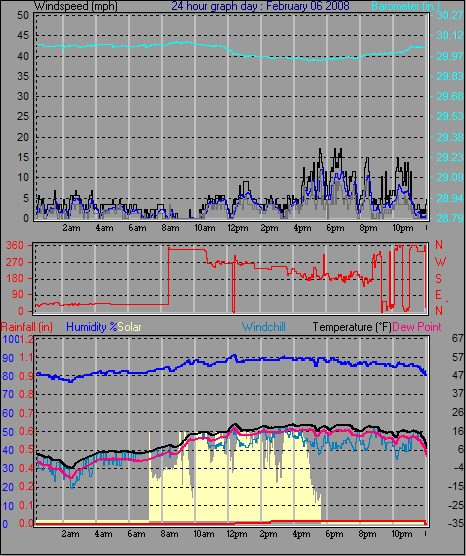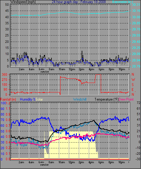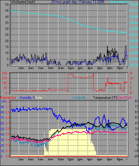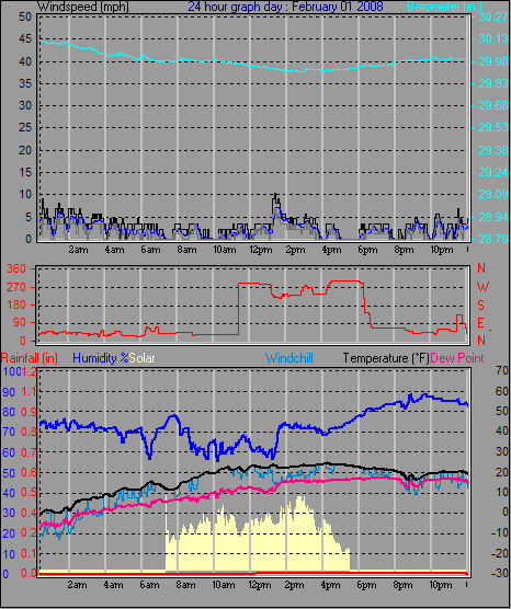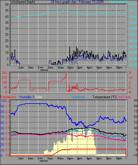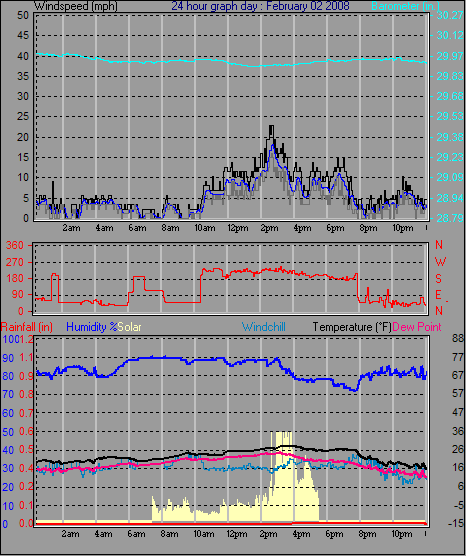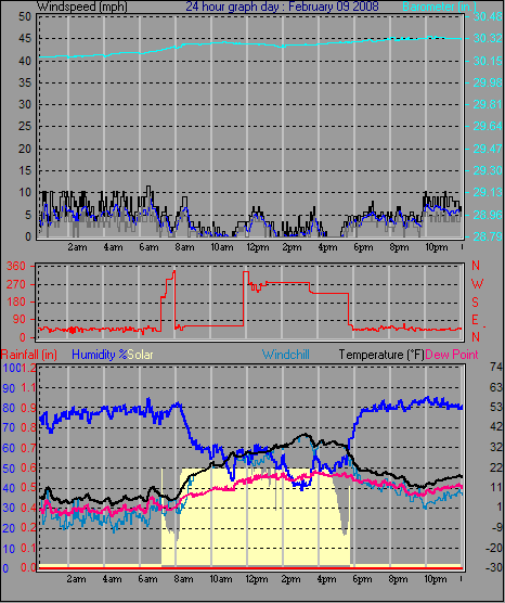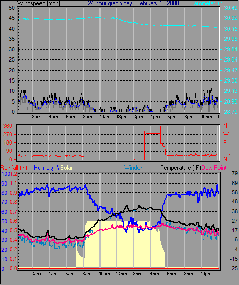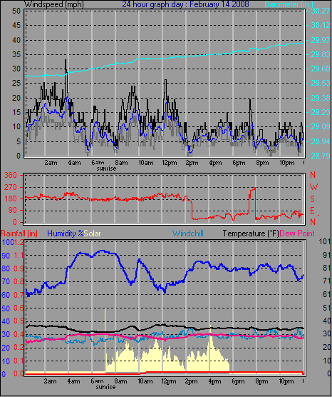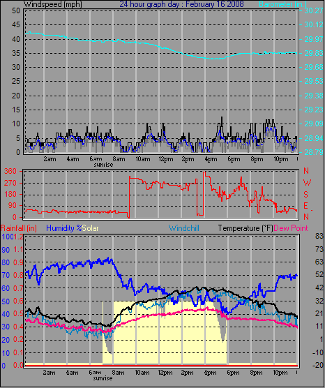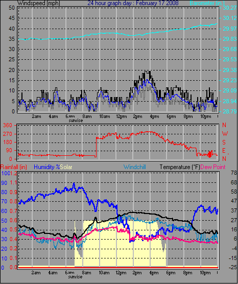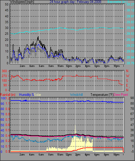 Averages\Extremes for the month of February to 29 2008 ------------------------------------------------------------ Average temperature 24.9 °F Average humidity 75 % Average dewpoint 17.5 °F Average barometer 30.01 in. Average windspeed 4.1 mph Average gustspeed 5.2 mph Average direction 139 ° ( SE) Rainfall for month 0.97 in. Rainfall for year 2.78 in. ----------------------------------------------------------- Maximum rain per minute 0.01 in. on day 23 at time 13:35 Maximum temperature 50.9 °F on day 28 at time 15:39 Minimum temperature -4.8 °F on day 07 at time 08:15 Maximum humidity 98 % on day 03 at time 21:24 Minimum humidity 23 % on day 26 at time 16:40 Maximum pressure 30.41 in. on day 26 at time 10:41 Minimum pressure 29.52 in. on day 03 at time 00:57 Maximum windspeed 23.0 mph from 224° on day 20 at time 23:37 Maximum gust speed 36.8 mph from 215° on day 20 at time 23:36 Maximum heat index 50.9 °F on day 28 at time 15:39 Growing degrees days : 32.0 °F ------------------------------------------- Sunshine hours , ET, Max solar for each day 01 00.6hrs ,ET :0.031 in. ,406.0 W/M² 02 01.3hrs ,ET :0.020 in. ,526.0 W/M² 03 00.0hrs ,ET :0.008 in. ,181.0 W/M² 04 00.3hrs ,ET :0.012 in. ,596.0 W/M² 05 02.6hrs ,ET :0.016 in. ,896.0 W/M² 06 06.5hrs ,ET :0.024 in. ,752.0 W/M² 07 06.4hrs ,ET :0.031 in. ,793.0 W/M² 08 08.1hrs ,ET :0.051 in. ,722.0 W/M² 09 08.7hrs ,ET :0.051 in. ,779.0 W/M² 10 08.8hrs ,ET :0.051 in. ,752.0 W/M² 11 08.6hrs ,ET :0.047 in. ,1002.0 W/M² 12 09.1hrs ,ET :0.051 in. ,740.0 W/M² 13 08.4hrs ,ET :0.059 in. ,759.0 W/M² 14 00.1hrs ,ET :0.039 in. ,376.0 W/M² 15 04.9hrs ,ET :0.051 in. ,954.0 W/M² 16 09.0hrs ,ET :0.063 in. ,925.0 W/M² 17 09.2hrs ,ET :0.059 in. ,770.0 W/M² 18 09.2hrs ,ET :0.059 in. ,782.0 W/M² 19 07.1hrs ,ET :0.059 in. ,962.0 W/M² 20 00.9hrs ,ET :0.043 in. ,754.0 W/M² 21 04.3hrs ,ET :0.047 in. ,1169.0 W/M² 22 01.7hrs ,ET :0.035 in. ,896.0 W/M² 23 06.2hrs ,ET :0.047 in. ,925.0 W/M² 24 00.0hrs ,ET :0.020 in. ,424.0 W/M² 25 08.8hrs ,ET :0.083 in. ,810.0 W/M² 26 09.5hrs ,ET :0.087 in. ,824.0 W/M² 27 09.1hrs ,ET :0.083 in. ,824.0 W/M² 28 08.4hrs ,ET :0.083 in. ,853.0 W/M² 29 00.0hrs ,ET :0.000 in. ,833.0 W/M² Sunshine hours month to date= 2.2 hrs Sunshine hours year to date= 576.3 hrs ------------------------------------------------------------ Daily rain totals 0.01 in. on day 1 0.01 in. on day 2 0.09 in. on day 4 0.11 in. on day 5 0.02 in. on day 6 0.05 in. on day 7 0.01 in. on day 8 0.02 in. on day 14 0.14 in. on day 15 0.14 in. on day 21 0.04 in. on day 22 0.22 in. on day 23 0.05 in. on day 24 0.06 in. on day 25 ------------------------------------------------------------