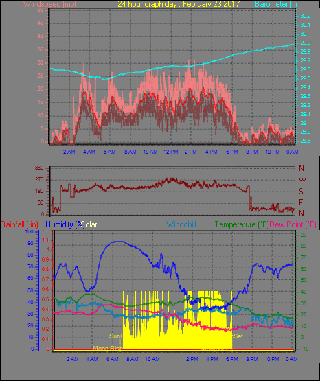 Maximum windspeed = 23.0 mph from 215°( SW) on day 23 at time 13:46