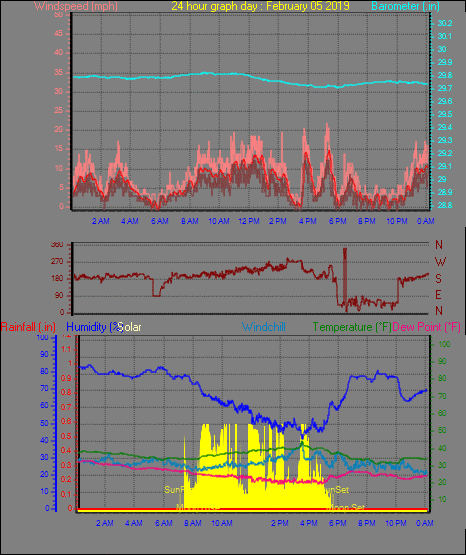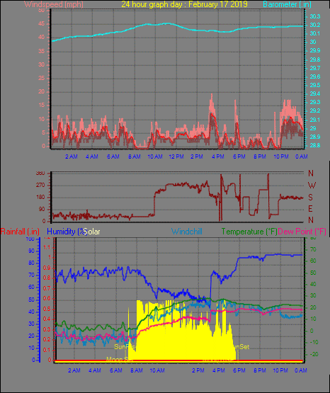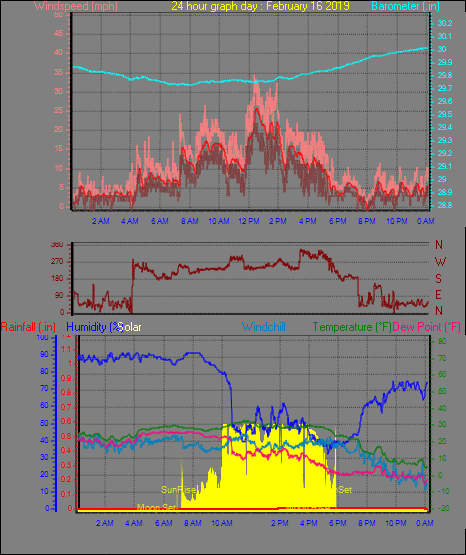 Maximum windspeed = 27.6 mph from 236°( SW) on day 16 at time 12:33