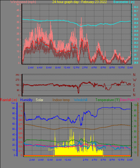 Maximum windspeed = 29.9 mph from 216°( SW) on day 21 at time 22:43