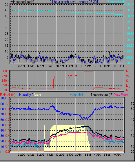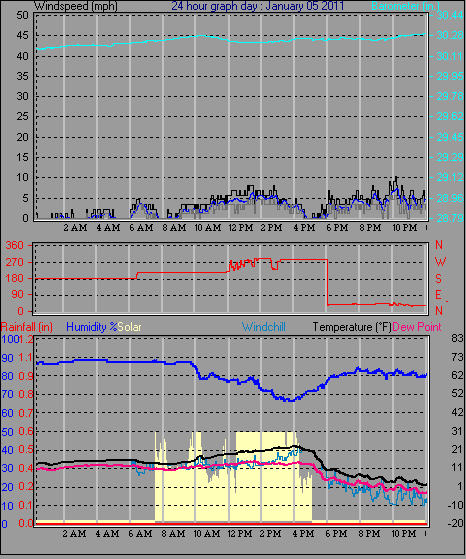 Maximum windspeed = 8.1 mph on day 05 at time 22:12