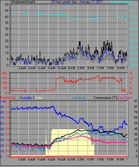 Maximum windspeed = 18.4 mph from 293°(WNW) on day 17 at time 20:03