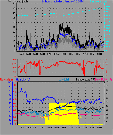 Maximum gust speed = 34.5 mph from 315°( NW) on day 10 at time 11:58