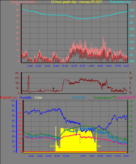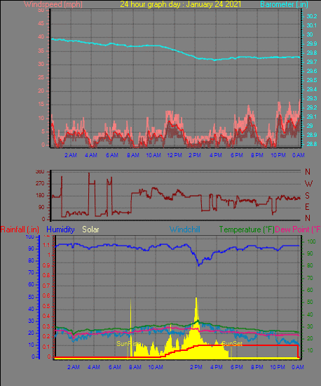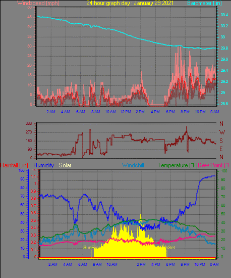 Maximum windspeed = 23.0 mph from 207°(SSW) on day 29 at time 20:37