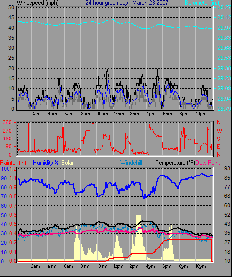 Maximum windspeed 23.0 mph from 251° on day 01 at time 15:27