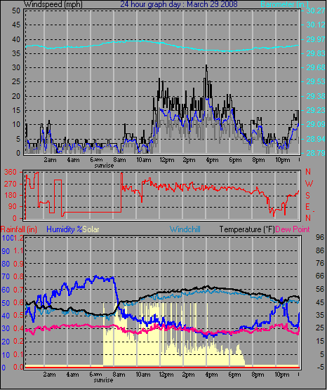 Averages\Extremes for the month of March to 31 2008 ------------------------------------------------------------ Average temperature 33.0 °F Average humidity 53 % Average dewpoint 16.0 °F Average barometer 30.03 in. Average windspeed 5.4 mph Average gustspeed 6.8 mph Average direction 258 ° (WSW) Rainfall for month 0.25 in. Rainfall for year 3.03 in. ----------------------------------------------------------- Maximum rain per minute 0.01 in. on day 18 at time 08:52 Maximum temperature 58.6 °F on day 30 at time 15:36 Minimum temperature 4.3 °F on day 07 at time 06:38 Maximum humidity 94 % on day 18 at time 11:02 Minimum humidity 14 % on day 24 at time 14:29 Maximum pressure 30.39 in. on day 10 at time 10:53 Minimum pressure 29.56 in. on day 16 at time 14:15 Maximum windspeed 35.7 mph from 229° on day 30 at time 21:44 Maximum gust speed 49.5 mph from 051° on day 28 at time 01:10 Maximum heat index 58.6 °F on day 30 at time 15:36 Growing degrees days : 32.0 °F ------------------------------------------- Sunshine hours , ET, Max solar for each day 01 09.6hrs ,ET :0.098 in. ,838.0 W/M² 02 03.8hrs ,ET :0.059 in. ,1102.0 W/M² 03 09.8hrs ,ET :0.075 in. ,844.0 W/M² 04 09.8hrs ,ET :0.087 in. ,849.0 W/M² 05 08.7hrs ,ET :0.083 in. ,881.0 W/M² 06 09.7hrs ,ET :0.083 in. ,940.0 W/M² 07 09.9hrs ,ET :0.079 in. ,863.0 W/M² 08 02.9hrs ,ET :0.051 in. ,881.0 W/M² 09 02.8hrs ,ET :0.055 in. ,1130.0 W/M² 10 06.3hrs ,ET :0.079 in. ,1083.0 W/M² 11 09.6hrs ,ET :0.106 in. ,886.0 W/M² 12 06.6hrs ,ET :0.102 in. ,933.0 W/M² 13 06.6hrs ,ET :0.087 in. ,1250.0 W/M² 14 09.4hrs ,ET :0.118 in. ,1013.0 W/M² 15 07.1hrs ,ET :0.102 in. ,1267.0 W/M² 16 09.5hrs ,ET :0.142 in. ,1188.0 W/M² 17 05.4hrs ,ET :0.067 in. ,1178.0 W/M² 18 09.1hrs ,ET :0.110 in. ,909.0 W/M² 19 10.1hrs ,ET :0.126 in. ,918.0 W/M² 20 08.9hrs ,ET :0.106 in. ,1016.0 W/M² 21 10.4hrs ,ET :0.126 in. ,921.0 W/M² 22 10.5hrs ,ET :0.130 in. ,925.0 W/M² 23 10.6hrs ,ET :0.138 in. ,932.0 W/M² 24 10.6hrs ,ET :0.157 in. ,942.0 W/M² 25 10.0hrs ,ET :0.165 in. ,937.0 W/M² 26 10.6hrs ,ET :0.157 in. ,928.0 W/M² 27 08.5hrs ,ET :0.165 in. ,983.0 W/M² 28 04.0hrs ,ET :0.126 in. ,1016.0 W/M² 29 03.9hrs ,ET :0.138 in. ,1269.0 W/M² 30 05.1hrs ,ET :0.177 in. ,1020.0 W/M² 31 00.0hrs ,ET :0.000 in. ,1234.0 W/M² Sunshine hours month to date= 2.2 hrs Sunshine hours year to date= 576.2 hrs ------------------------------------------------------------ Daily rain totals 0.02 in. on day 2 0.08 in. on day 3 0.14 in. on day 17 0.01 in. on day 18 ------------------------------------------------------------