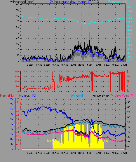 Maximum gust speed = 50.6 mph from 270°( W ) on day 17 at time 15:58