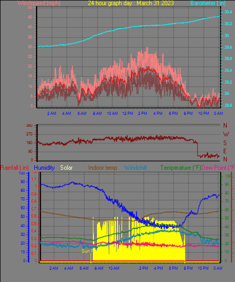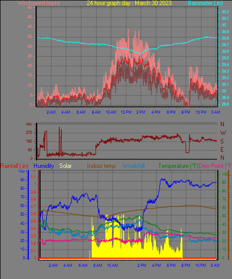 Maximum windspeed = 28.8 mph from 173°( S ) on day 30 at time 12:21