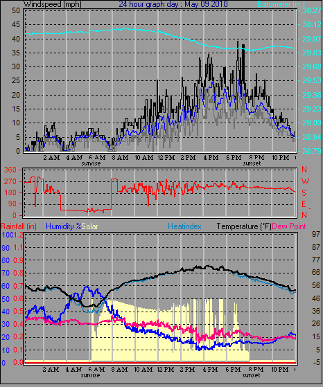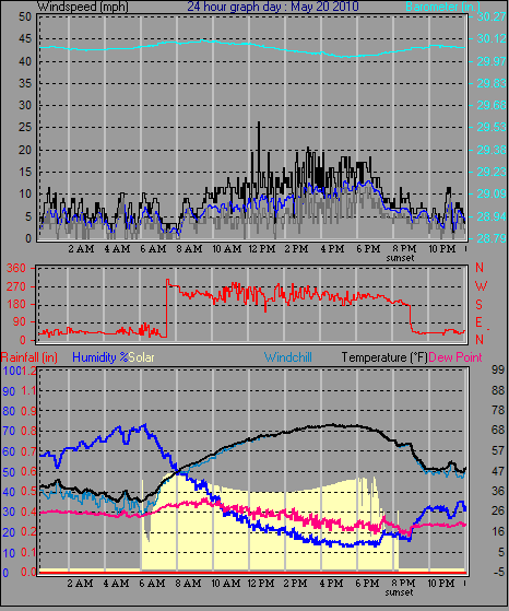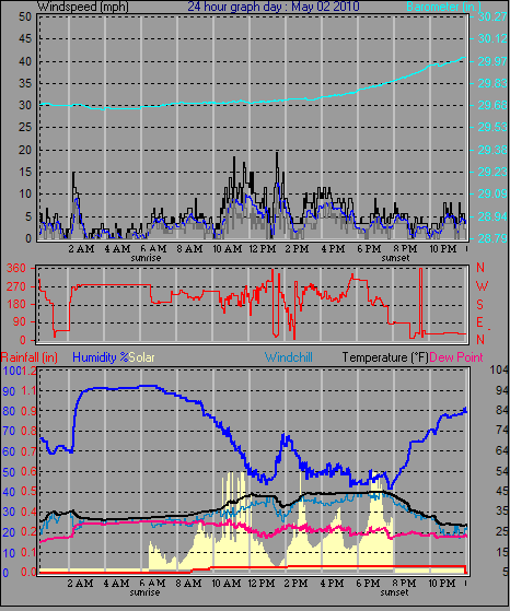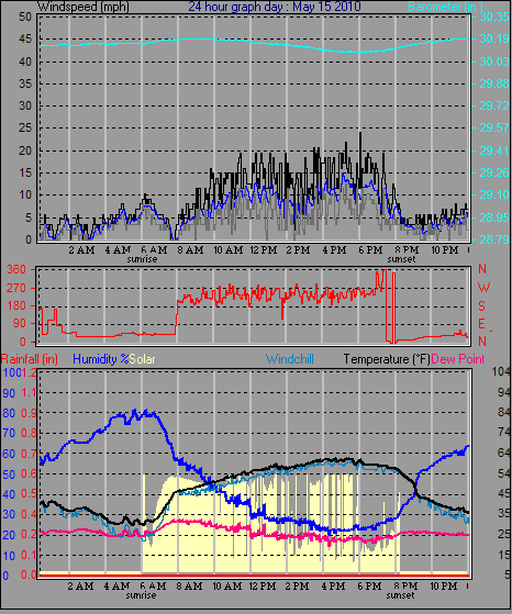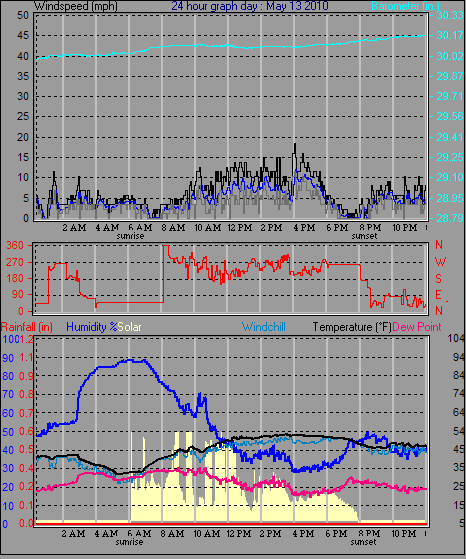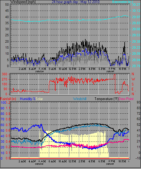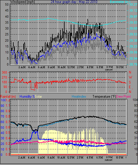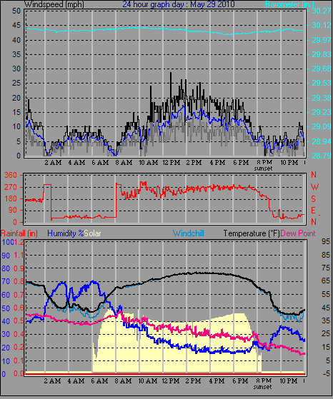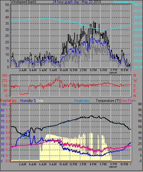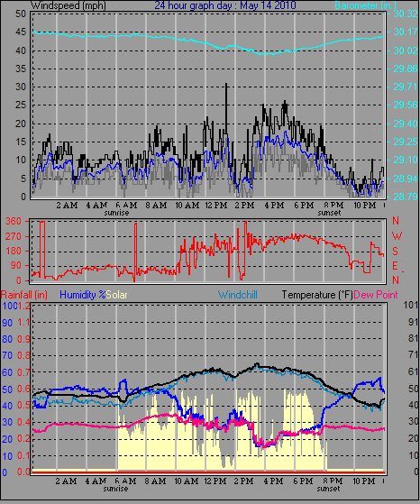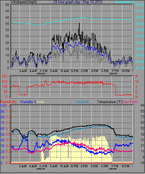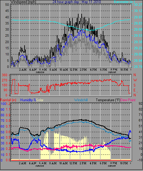 Maximum windspeed = 33.4 mph from 225°( SW) on day 11 at time 14:25