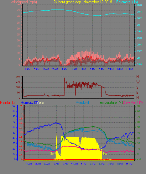 Maximum gust speed = 27.6 mph from 253 °(WSW) on day 30 at time 11:18