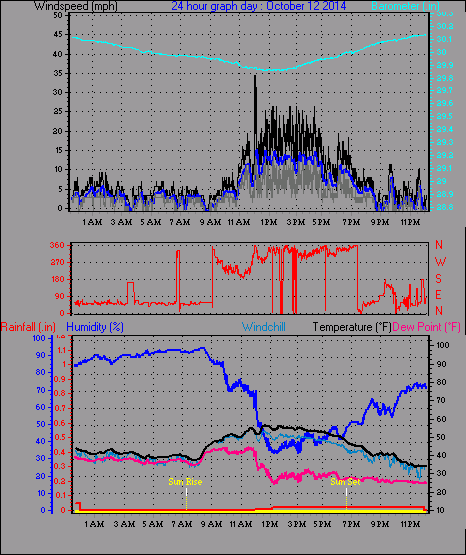 Maximum gust speed = 34.5 mph from 338°(NNW) on day 12 at time 12:06