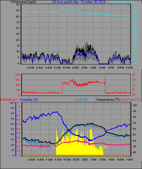 Maximum gust speed = 18.4 mph from 225 °( SW) on day 30 at time 14:35