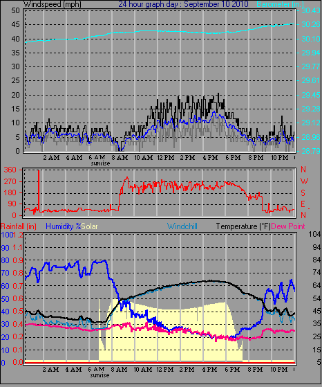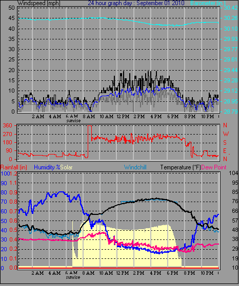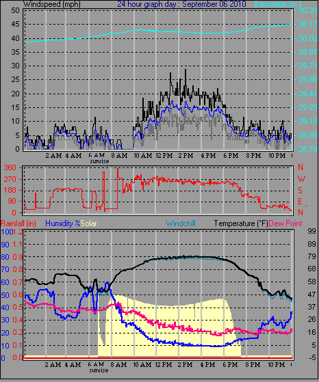 Maximum windspeed = 24.2 mph from 225°( SW) on day 08 at time 18:11