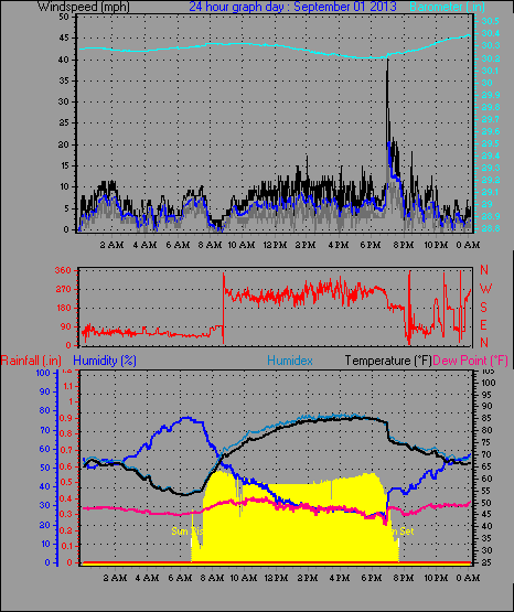 Maximum gust speed = 40.3 mph from 203 °(SSW) on day 01 at time 18:59