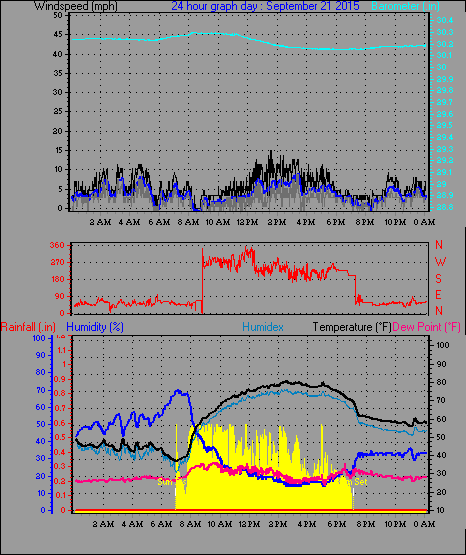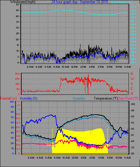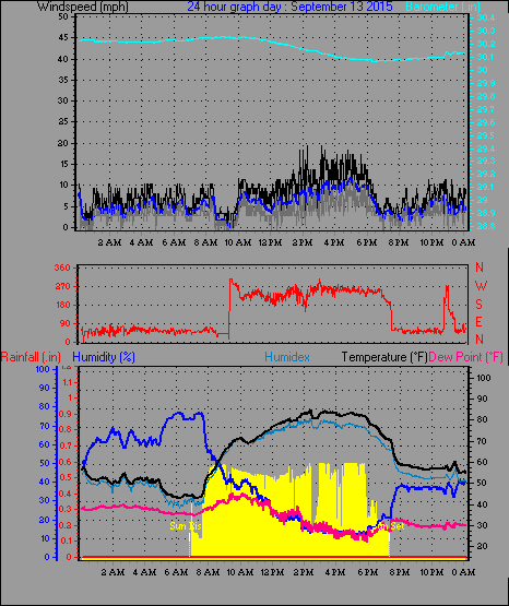 Maximum gust speed = 15.0 mph from 225 °( SW) on day 30 at time 15:49