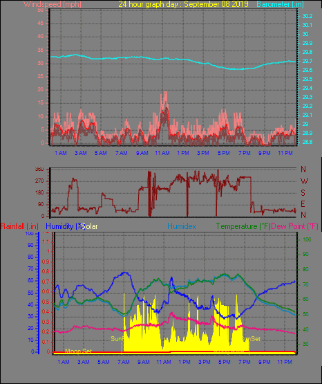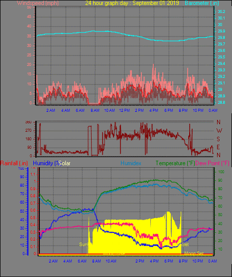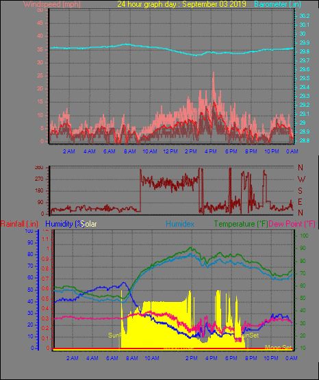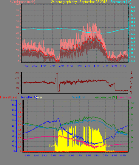 Maximum windspeed = 26.5 mph from 213°(SSW) on day 29 at time 16:46