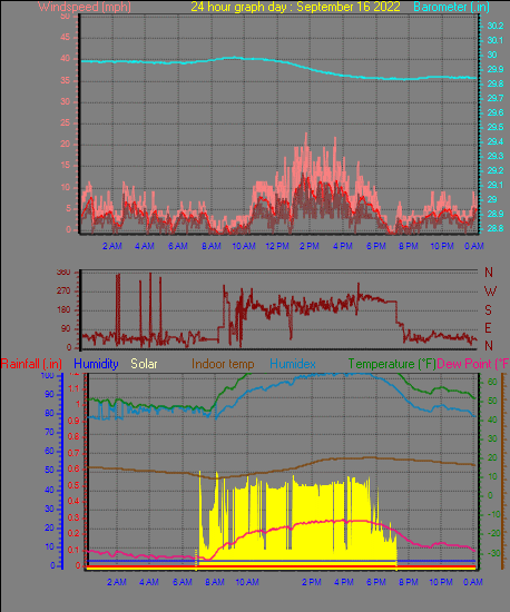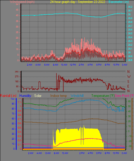 Maximum windspeed = 23.0 mph from 168°(SSE) on day 09 at time 16:53