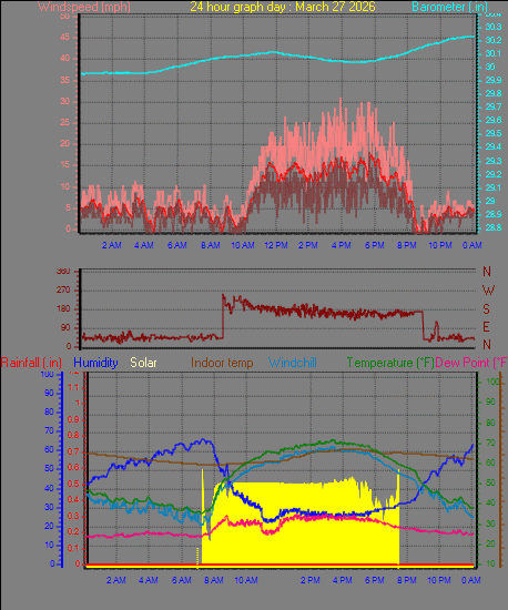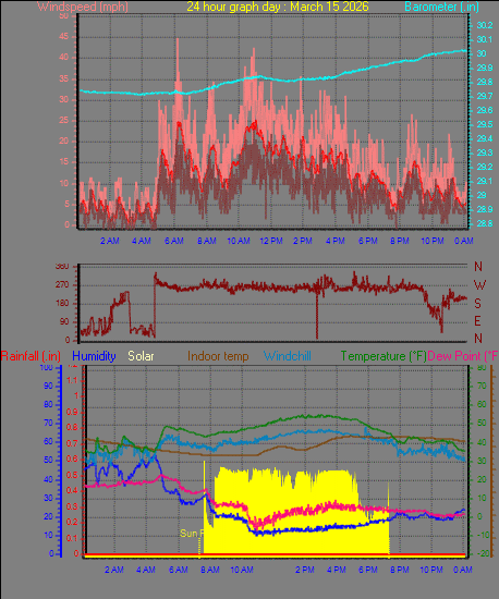 Maximum windspeed = 33.4 mph from 267°( W ) on day 15 at time 10:57